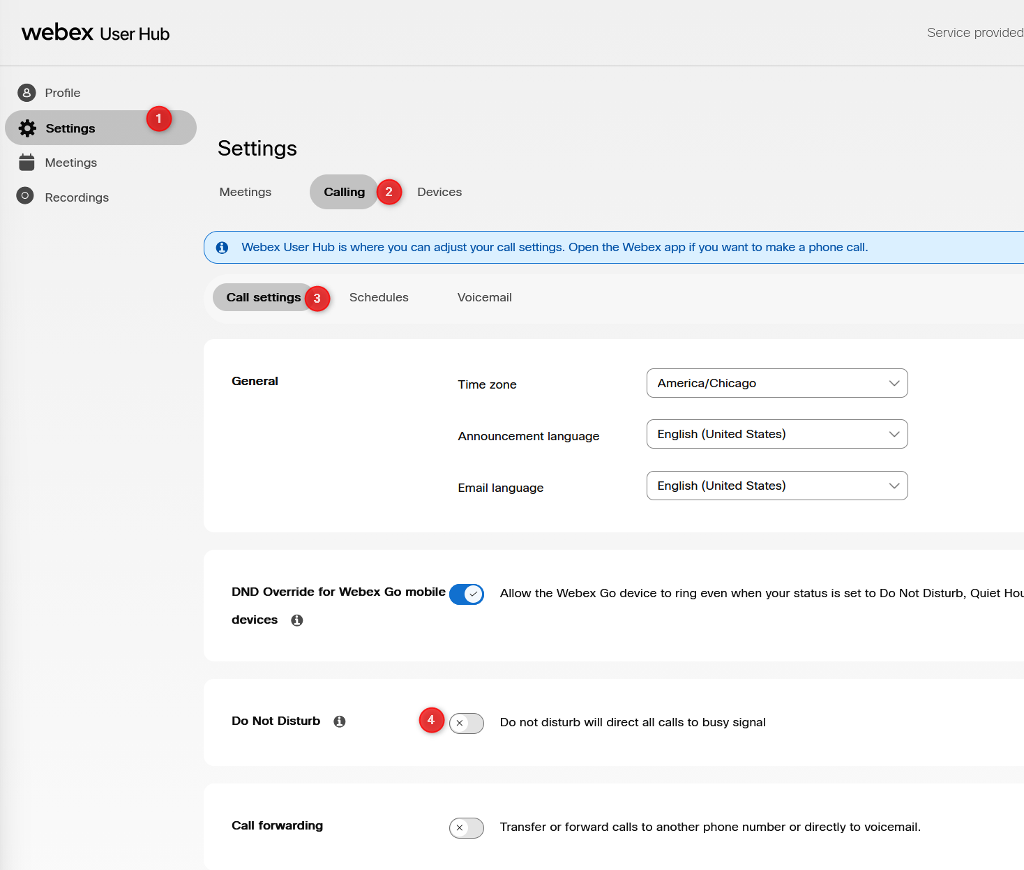 Stuck in Do not Disturb Jimmy Sopha December 01, 2025 17:58 Steps to turn off Do not DisturbIf you go to user.webex.com and sign in with your email and passwordSelect settings on the left sideSelect the Calling tabToggle off the Do Not Disturb setting Related articles Account Lockout Reset Voicemail Pin WebEx troubleshooting Comments 0 comments Article is closed for comments.